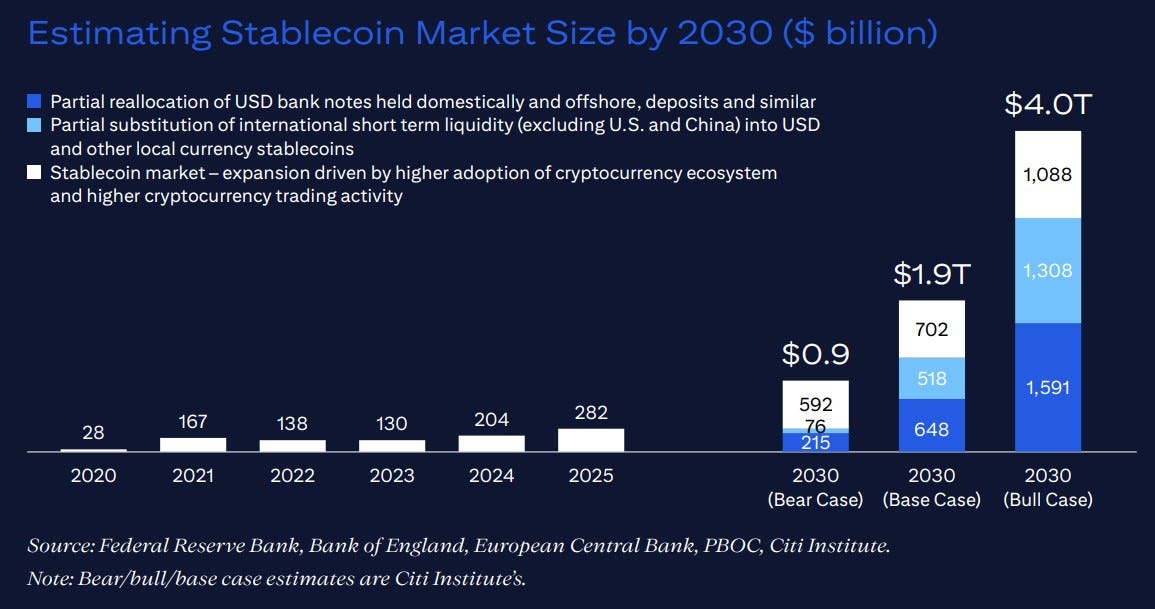 O Citigroup projeta que o mercado de stablecoins pode atingir US$ 4 trilhões até 2030, partindo dos atuais US$ 282 bilhões - crescimento de 14 vezes em cinco anos.
