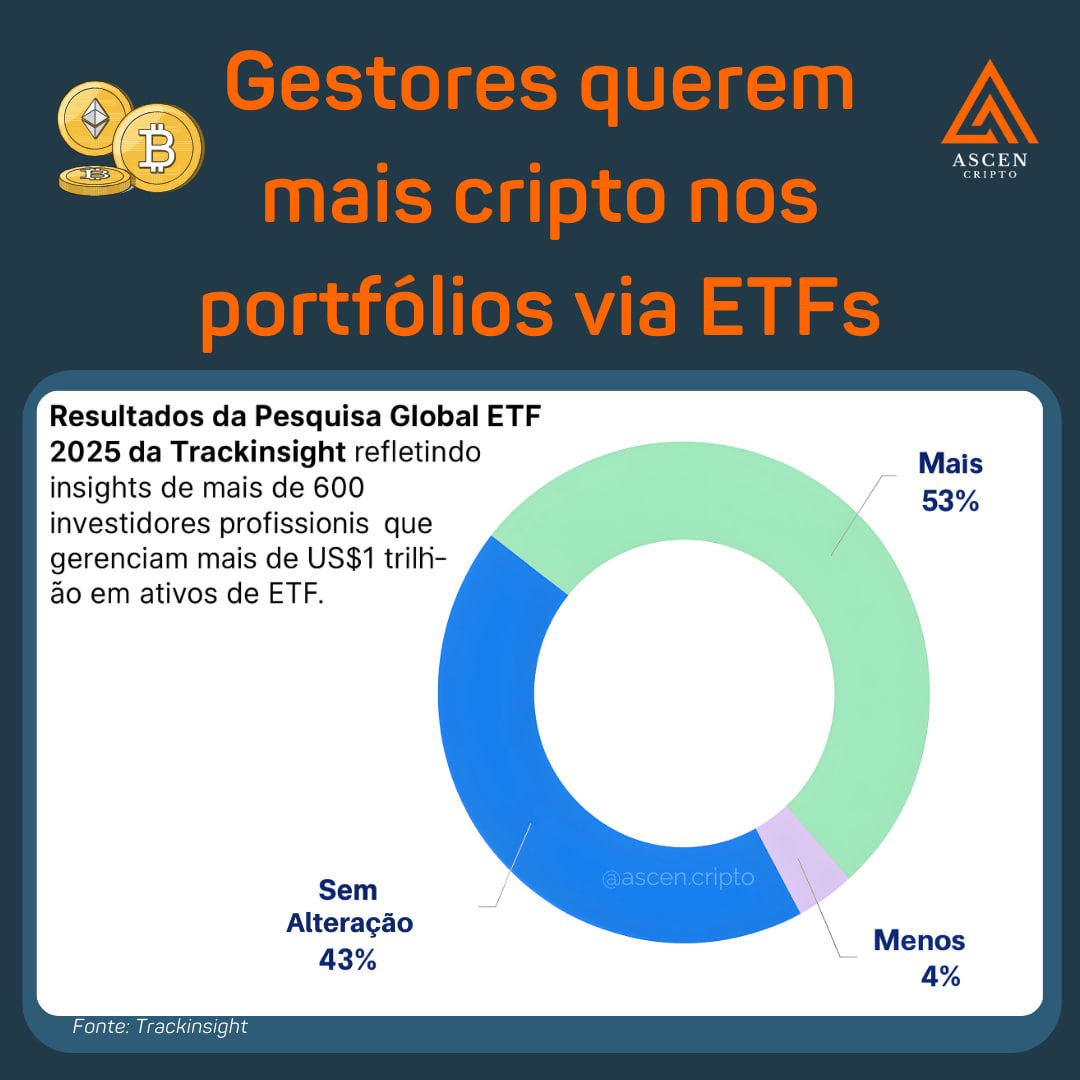 Mais da metade dos grandes investidores globais pretende aumentar a exposição a ETFs de criptomoedas em 2025, segundo a pesquisa Global ETF Survey da Trackinsight, que ouviu mais de 600 profissionais com mais de US$ 1 trilhão em ativos sob gestão.