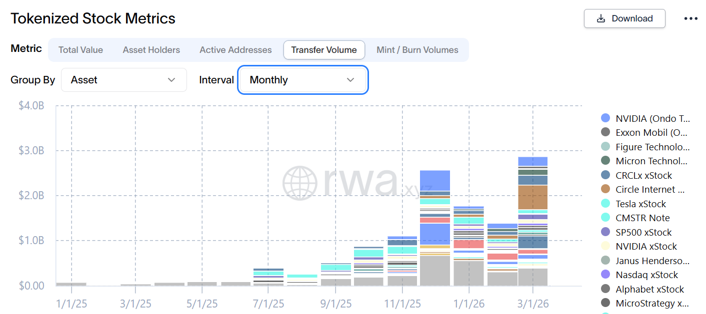 🟠Ações tokenizadas disparam e atingem US$ 2,94 bilhões em volume mensal