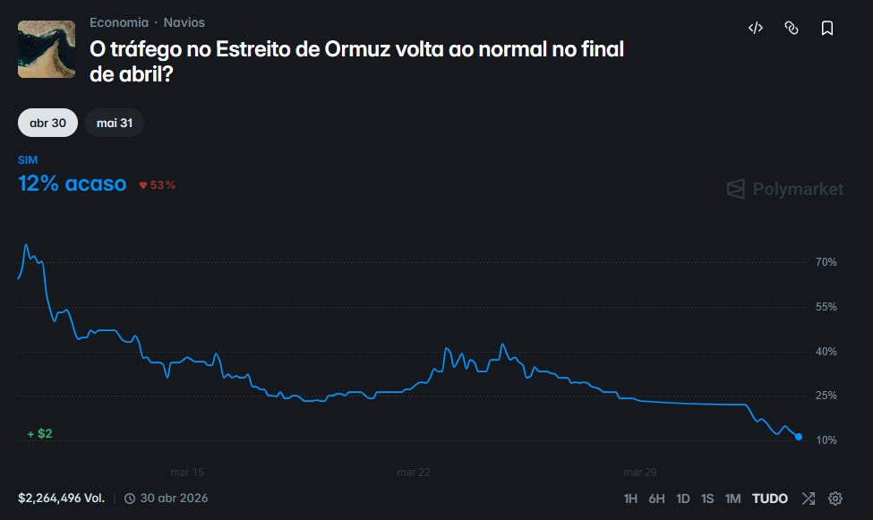 Dados de mercado indicam que investidores não esperam normalização imediata. Estimativas apontam baixa probabilidade de cessar-fogo no curto prazo e manutenção das restrições no Estreito, o que sustenta a leitura de um choque prolongado de oferta energética global.