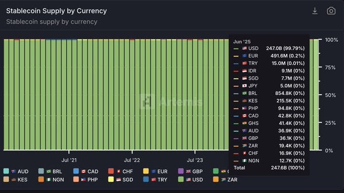 Atualmente, stablecoins em dólar americano (USD) dominam cerca de 99% do mercado, com EURC (stablecoin de euro) representando apenas 0,2%. Porém, a demanda por negociação de stablecoins não-USD está crescendo gradualmente devido a melhores taxas do que o mercado financeiro tradicional.