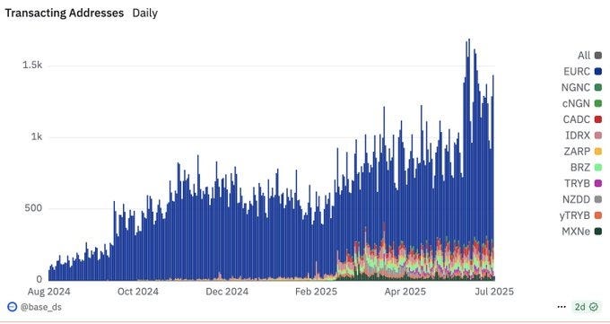 Dadas as taxas de câmbio competitivas e as incertezas econômicas mais amplas, começamos a ver crescimento no EURC, com endereços ativos diários dobrando de 600 para 1.300 desde fevereiro na Base (Layer 2 da Ethereum) da Coinbase.